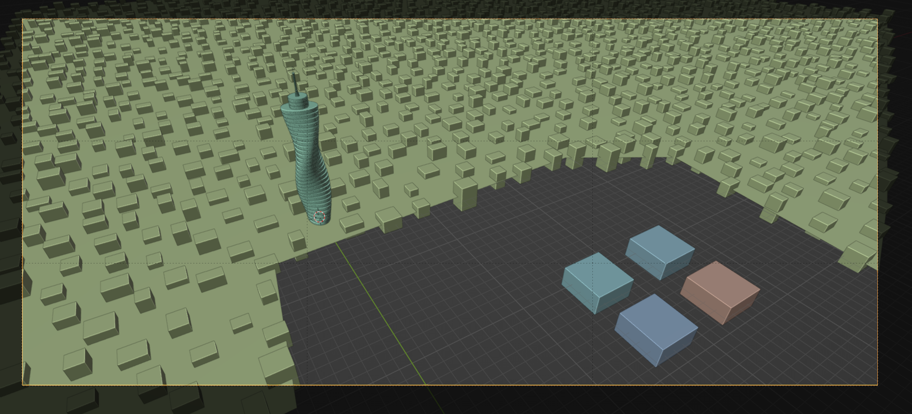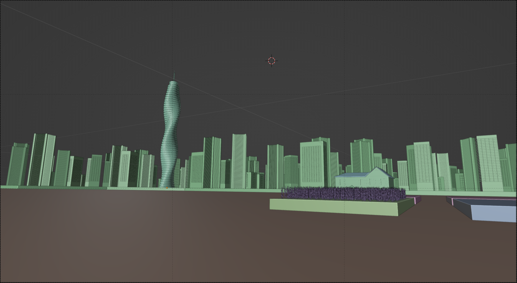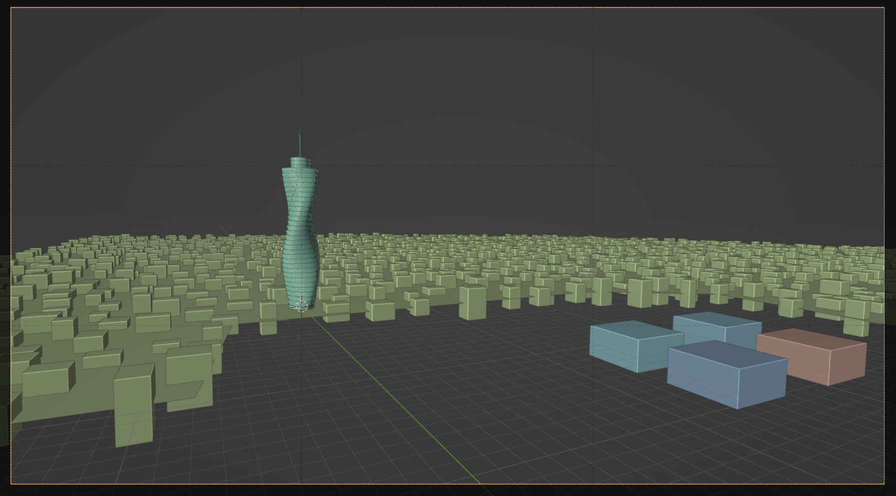 The idea of the shot is a picture of a cyberpunk cityscape, with contrasting elements of a floating farm (where Anne lives) and a skyscraper (where the bad guys are). I had a hero element of the skyscraper (a complicated nest of geometry nodes), blocks for stand-ins for buildings, and a few blocks for the floating farms. The first attempt at framing looked like this: