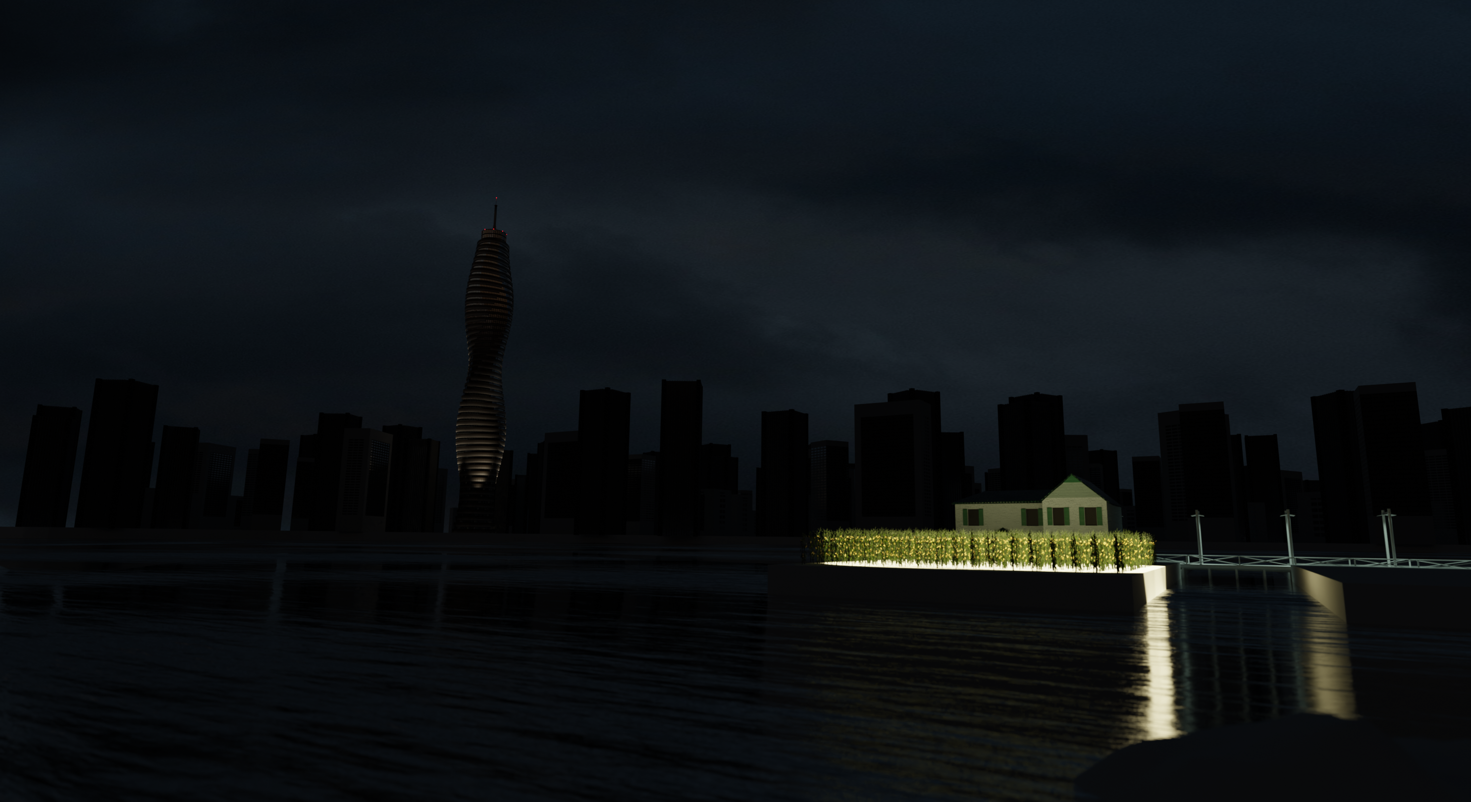 To play around with some of the lights and silhouettes, I’ve put in a sky, a shore in the foreground, and minimal lighting.